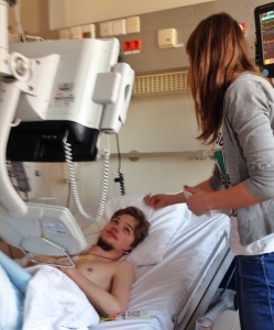 Cleo is mee op bezoek vandaag. Kan ze haar economie-huiswerk maken, haar grote broer een beetje bijpraten en vertellen over de open dag in het Maxima Medisch Centrum waar ze zaterdag geweest is. En hem verwennen met speciaal gekocht snoep en lekker drinken. Niet teveel en niet te zout, want de vochtbeperking staat op 1,5 liter en hij moet natriumarm eten. Geen drop dus. Hij heeft het ‘multi-entertainmentsysteem’ dat alle patiënten boven hun bed hebben al helemaal uitgevogeld. Niks op tv, dus gaat hij nog maar even een dutje doen voor straks het avondeten gebracht wordt. Na de kleine porties van gisteren heeft hij nu grote porties bloemkool en aardappelpuree besteld.