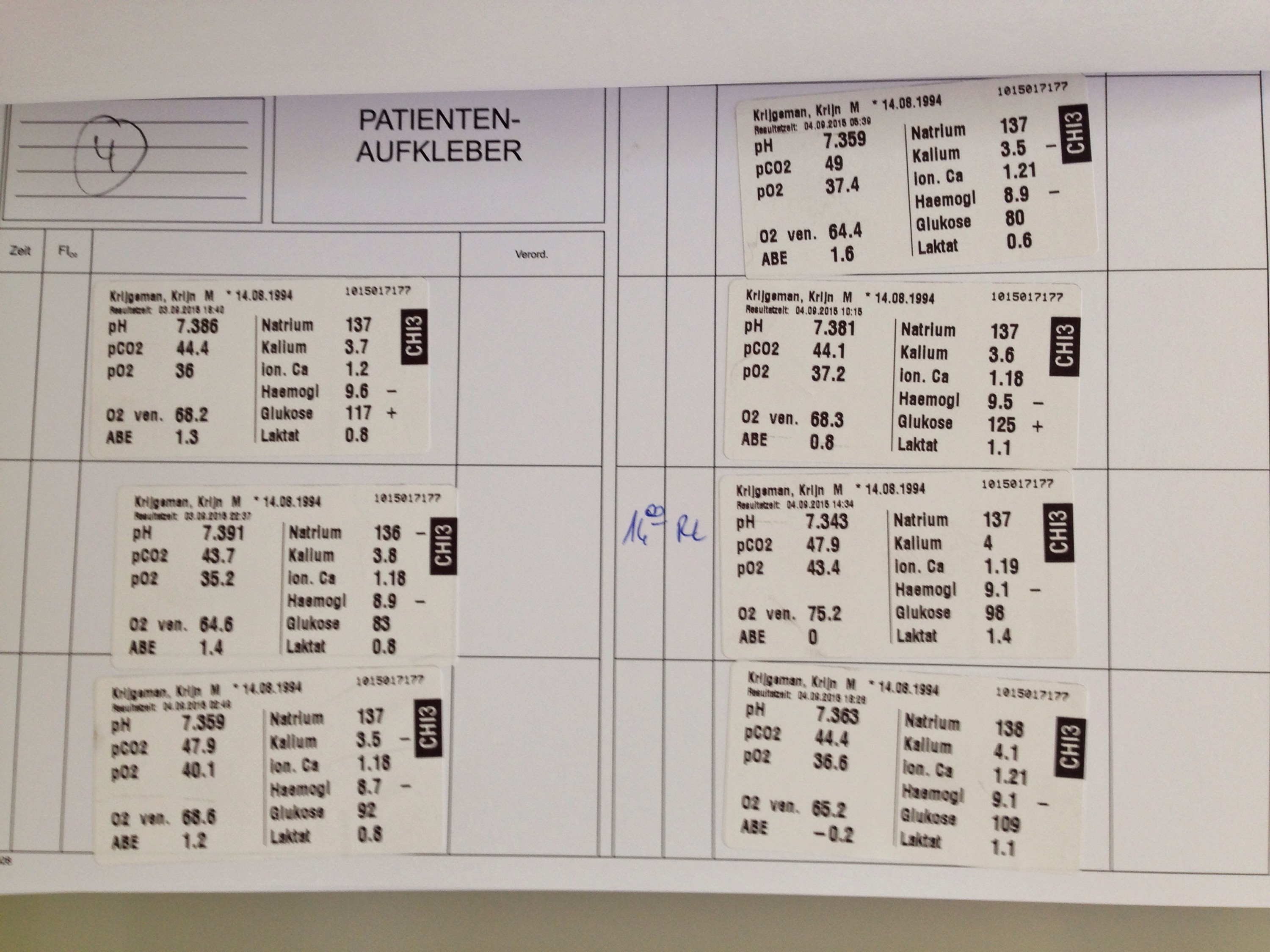De coördinator was duidelijk: ‘Voor mij telt maar één ding en dat is dat alles rond de transplantatie soepel verloopt. Al het andere moet daarvoor wijken. Ik bekijk hoe het optimaal geregeld kan worden. En dan bedoel ik het zo ontspannen mogelijk kunnen voorbereiden van de patiënt – onderzoeken, scheren en dergelijke – het coördineren van het uitnameteam en alles voor de transplantatie zelf. Wat de familie betreft is vooral belangrijk dat ze niet halsoverkop een auto inspringen en als een gek hierheen rijden – met alle risico’s van dien. Dus adviseer ik om heel rustig aan te doen en pas ná de operatie te komen. Bij voorkeur zelfs een dag later, als de patiënt weer hier, naar deze gewone afdeling komt.’ Gewone? Deze intenvise care een gewone afdeling? Maar hij vertelt alweer verder. ‘De eerste dag kán het zijn dat hij naar een andere afdeling en een speciale kamer gaat. Een waar nog meer mogelijk is dan hier op deze intensive care, bijvoorbeeld het ter plekke meten van bloedgassen.’ O, op die manier. De procedure hier op de IC is dat bij Krijn 6x per dag buisjes bloed worden afgenomen, die verderop in de gang in een koker naar het lab geschoten worden en daar direct onderzocht. Even later komt een verpleger met een nieuw stickertje vol afkortingen en getallen de kamer op en plakt de actuele uitslag op het blaadje dat aan de muur bij de schuifdeur hangt. Uiteraard staat het dan ook al op tabblad zoveel in de computer.