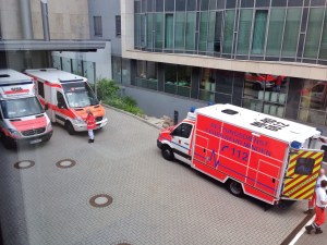 In het appartement, onderweg, bij het boodschappen doen, bij iedere helicopter kijk ik wat voor eentje het is en waar hij heen gaat. Meestal van of naar ‘ons’ ziekenhuis, op een enkele verkeershelicopter na. Dagelijks landen ze op het dak van het HDZ-NRW. Als ik toevallig net op weg ben met de fiets, trap ik als een gek om eerder bij het ziekenhuis te zijn dan de helicopter. Voor hij met oorverdovend lawaai het laatste stukje loodrecht naar beneden zakt en voorzichtig wiebelig landt op het dak schuin achter de hoofdingang en de rotorbladen gierend uitdraaien. Dan wordt er óf een brancard uitgereden, óf een Notarzt stapt uit óf geeft de piloot alleen een koelbox over aan een aangesnelde verpleegkundige – ze neemt hem aan en haast zich de windvlagen gebukt ontwijkend weer naar binnen. Dat laatste van die verpleegster fantaseer ik trouwens, dat heb ik nog nooit gezien. Maar dat hoop ik soms zó. Misschien is het wel Krijns nieuwe hart. Wie weet… Slaat nergens op, maar ik wil het zo graag. Toen ik dat Krijn gisteren vertelde, zei hij – waarschijnlijk terecht – ‘nee hoor, als mijn hart met de helicopter komt, dan weten we dat allang voor hij hier landt.’