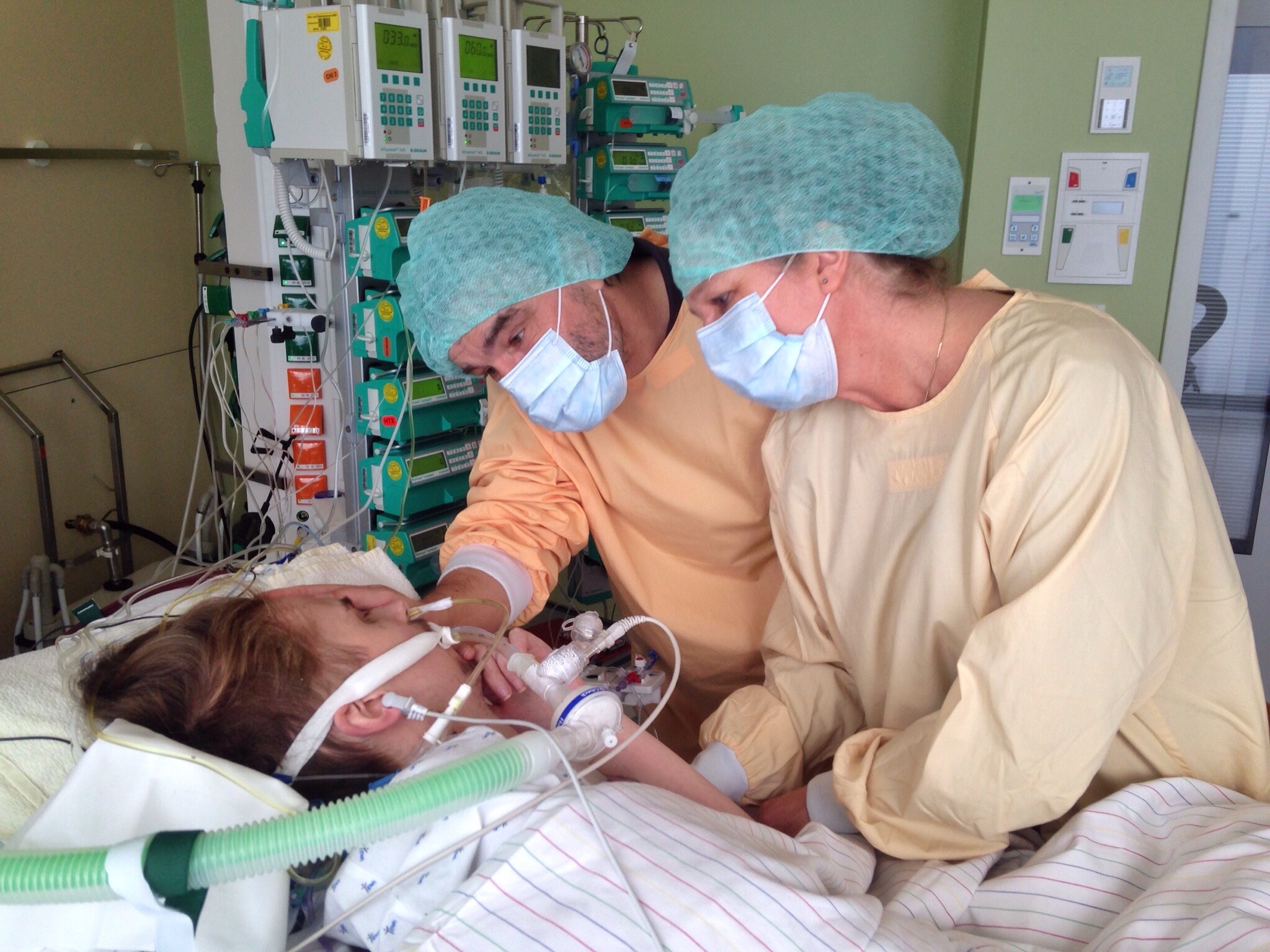 We gingen met z’n drieën in de officiële wachtkamer zitten. Waar Robin en Cleo vooral bezorgd waren over hoe ik eraan toe was. Ik was er namelijk van overtuigd dat het einde verhaal was en verkeerd zou aflopen. Stikken. Zuurstoftekort. Mislukte beademing, noem het maar. Na een uurtje is Robin gaan vragen hoe het ermee stond, terwijl Cleo en ik in de wachtkamer bleven. Even later wenkte hij ons. Het was achter de rug en D. had hem uitgelegd wat er gebeurd was. Dat Krijn weer opnieuw geïntubeerd moest worden. Hij had zichzelf bewusteloos geademd, dat was wel duidelijk. Teveel Co2 in zijn bloed. D. snapte ook niet hoe dat kon. Alles leek vooraf goed, maar hij vertelde precies wat ik ook gezien had. Dacht zelfs nog even dat de maagsonde – waar Krijn alleen wat water doorheen krijgt – misschien verkeerd had gezeten, maar dat was ook niet zo. Op CT, röntgen, wat we vooraf konden zien/horen en uit de gemeten waarden was dit niet te voorspellen geweest. D. was behoorlijk bedrukt doordat het ondanks alles niet gelukt was. Zocht naar wat ontspanning en toen we aan zijn bed stonden, sprak hij Krijn op strenge toon toe: ‘Du machst immer alles anders als wir erwarten, Krijn. Damit musst du aufhören, oder du bekommt nichts mit Weihnachten.’ (Je doet alles steeds anders dan we verwachten. Ophouden daarmee, anders krijg je geen cadeautjes met Kerst.)