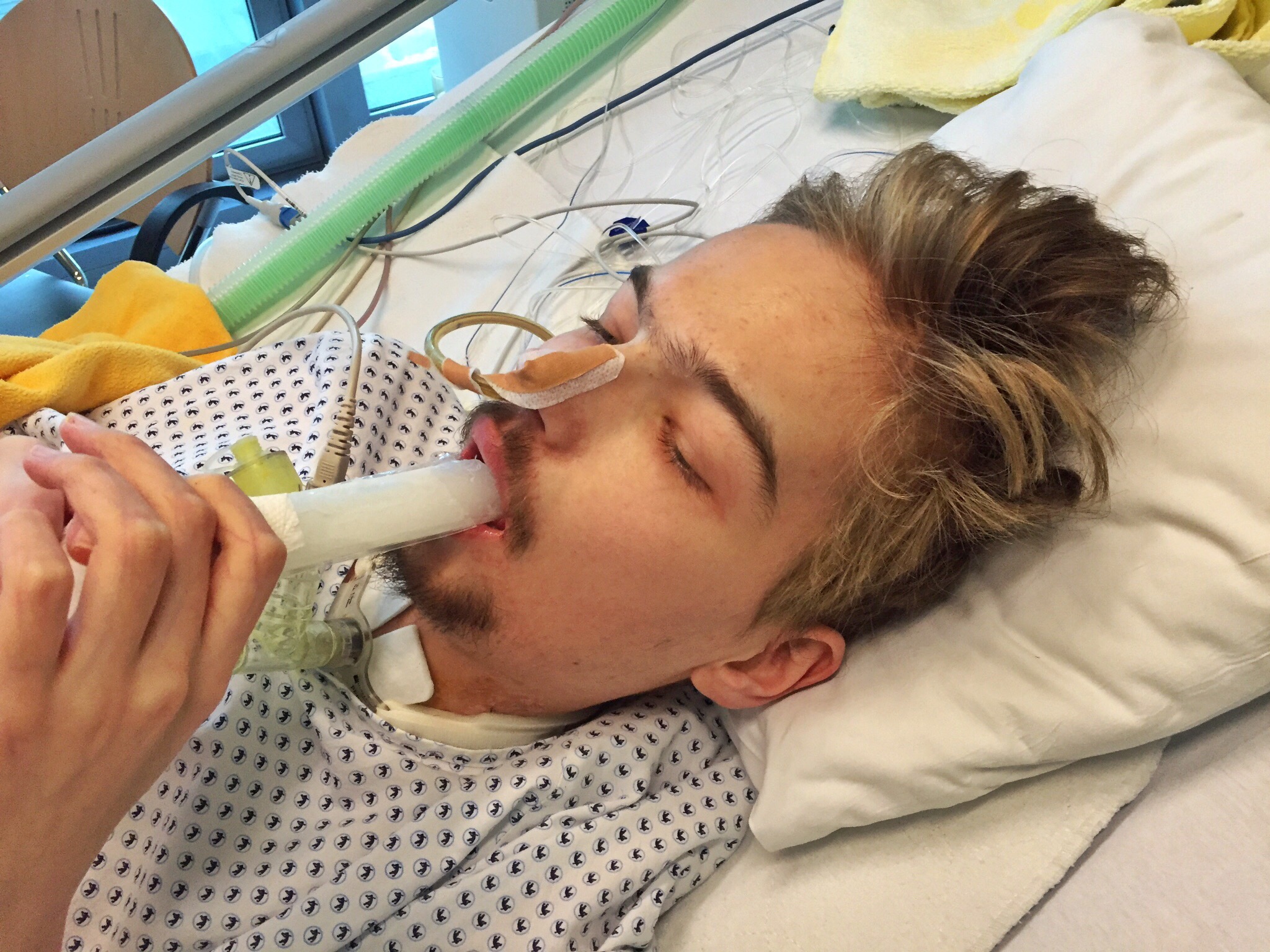 ‘We proberen het gewoon’ zei nog geen week geleden de verpleegkundige toen ze de ‘feuchte Nase’ voor het eerst opzette. Het speciale filterkopje op het buisje uit Krijns hals neemt de neusfunctie (lucht bevochtigen en verwarmen) over als de beademingsmachine uitgezet wordt. Zuurstofslangetje eraan voor extra ondersteuning. Krijn was er na een minuut of twee al helemaal klaar mee. Te moeilijk, te zwaar, het lukte echt niet langer. Nu zondag heeft hij twee keer een uur (!) zonder al teveel morren – want dat blijkt een groter probleem dan zuurstoftekort of uitputting – met het filtertje op gezeten. Rechtop in bed met de tv aan. Duidelijke en realistische doelen stellen, dat is de kunst. Dan gaat het hard. Relatief uiteraard. Als hij scheef zakt kan hij zich niet zelf tegenhouden of corrigeren bijvoorbeeld, maar toch.