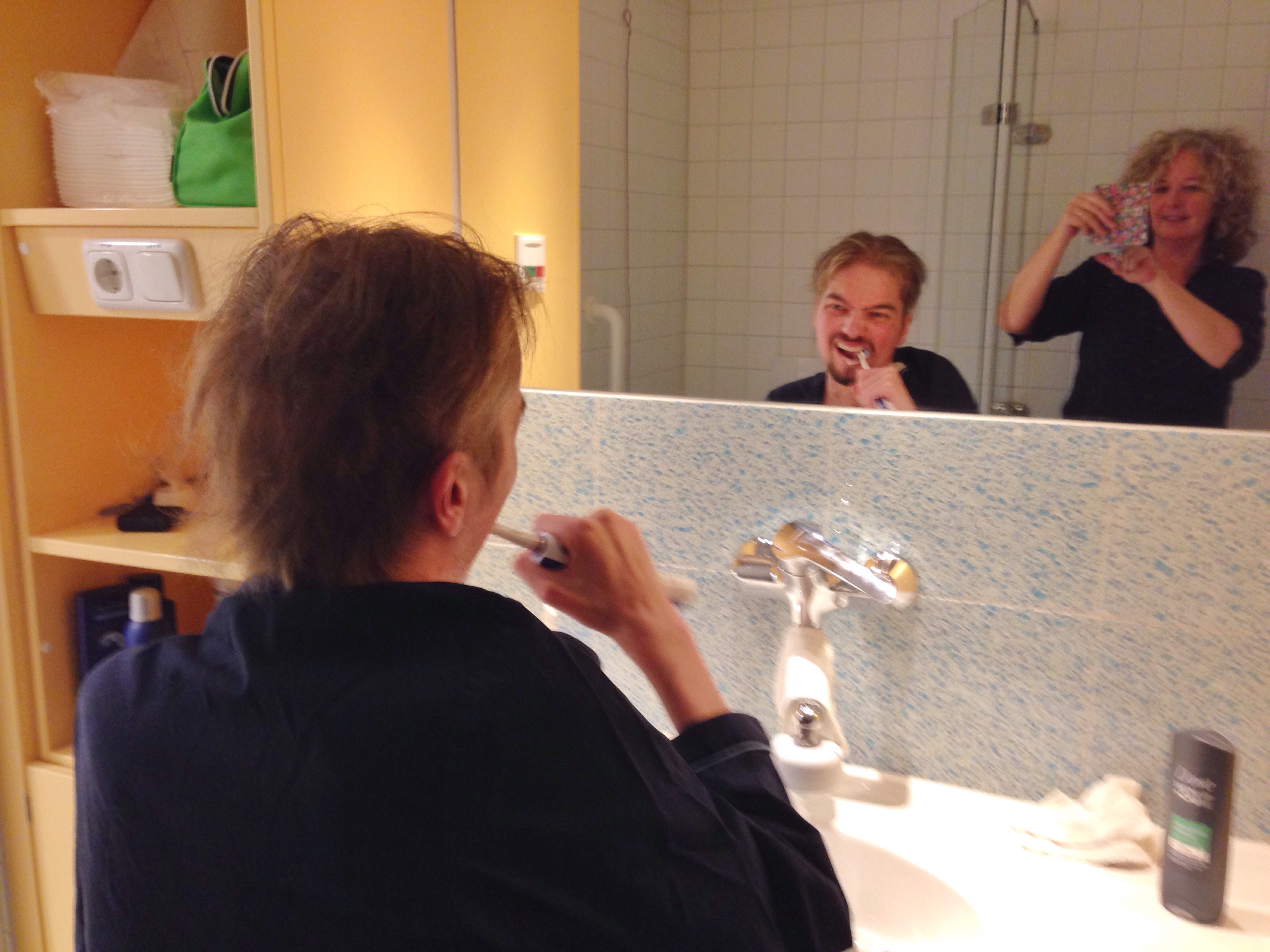 Langzaam kunnen we oefenen en wennen aan een normaal leven thuis. Met een aantal vaste extra verplichtingen: 4x per dag pillen en antischimmelsubstantie nemen en vernevelen, 2x per dag temperatuur, bloeddruk, hartslag en gewicht opnemen en 1x buikomvang meten. Niet meer de hele dag afwachtend in bed moeten liggen in een ziekenhuishes. Nee, ’s nachts een pyjama aan en overdag uit bed en bijvoorbeeld een joggingbroek. T-shirt gaat nog niet helaas. Sokken en gympen wel. Deze Tweede Kerstdag was ook voor Krijn bijzonder: voor het eerst heeft hij weer zelf zijn sokken en gympen aangetrokken. Inspannend en tijdrovend, maar gelukt. En voor het eerst is hij in de badkamer geweest. De paar meters erheen gelopen met de rollator – infuuspompen en pacemaker mee in het mandje – omdraaien en voor de wastafel gaan zitten op de rollator. Handen en gezicht gewassen. Tanden poetsen. Gewoon bij de kraan aan de wastafel. Eindelijk. Na bijna 9 maanden gedoe met niervormige spuugbakjes.