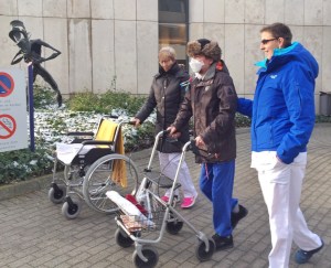 Terug naar begin afgelopen week: ‘Ik ga proberen te regelen met de Oberarzt dat hij naar buiten mag’, had de lieve fysio gezegd. ‘Zorgen jullie er alvast voor dat hij hier dan een dikke jas, muts en zo heeft?’ Zijn winterjas… o ja, die had hij aan toen hij maart vorig jaar naar het ziekenhuis in Utrecht ging voor controle. Maakt sindsdien onderdeel uit van het stapeltje met Krijns spullen dat steeds mee verhuisd is van appartement naar appartement. Afgelopen donderdag 7 januari 2016 was het zover: Krijn zette voor het eerst weer een paar stappen in de buitenlucht. In zijn ruimzittende winterjas en getooid met bontmuts en speciaal mondkapje stiefelde hij vanaf de hoofdingang van het ziekenhuis achter de rollator. Geflankeerd door de twee fysiotherapeutes, een rolstoel en een filmende Robin. Het vroor en er lag in het kale groen nog een restantje sneeuw. Hij werkte hard en liep tot het witte bankje halverwege de oprit. Exact even ver als de laatste keer dat hij buiten was. En toch, wat een contrast. Dat was op een prachtige zomerse septemberdag – toen rolde de grote, luidtikkende console van zijn kunsthart letterlijk aan zijn zij. Lang, lang geleden, in een vorig leven.