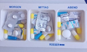 Alleen de bloedverdunner heparine gaat nog via een infuuspomp naar de – alweer vernieuwde – katheter in zijn hals. Voor de rest kan hij inmiddels vrijwel alle medicatie in pilvorm innemen. Daarvoor krijgt hij iedere ochtend een speciaal voor hem klaar gemaakt doosje met vier vakjes: Morgen, Mittag, Abend, Nacht. Vooral de ochtendportie is bijna een maaltijd op zich. Zeker als zijn kalium te laag is en hij soms wel 5 geelwitte capsules extra moet innemen. Om vervolgens al die kalium weer net zo hard uit te plassen; de nieren hebben nog moeite met de juiste afstelling en filteren niet goed. Vanavond daarom weer aan de dialyse.
