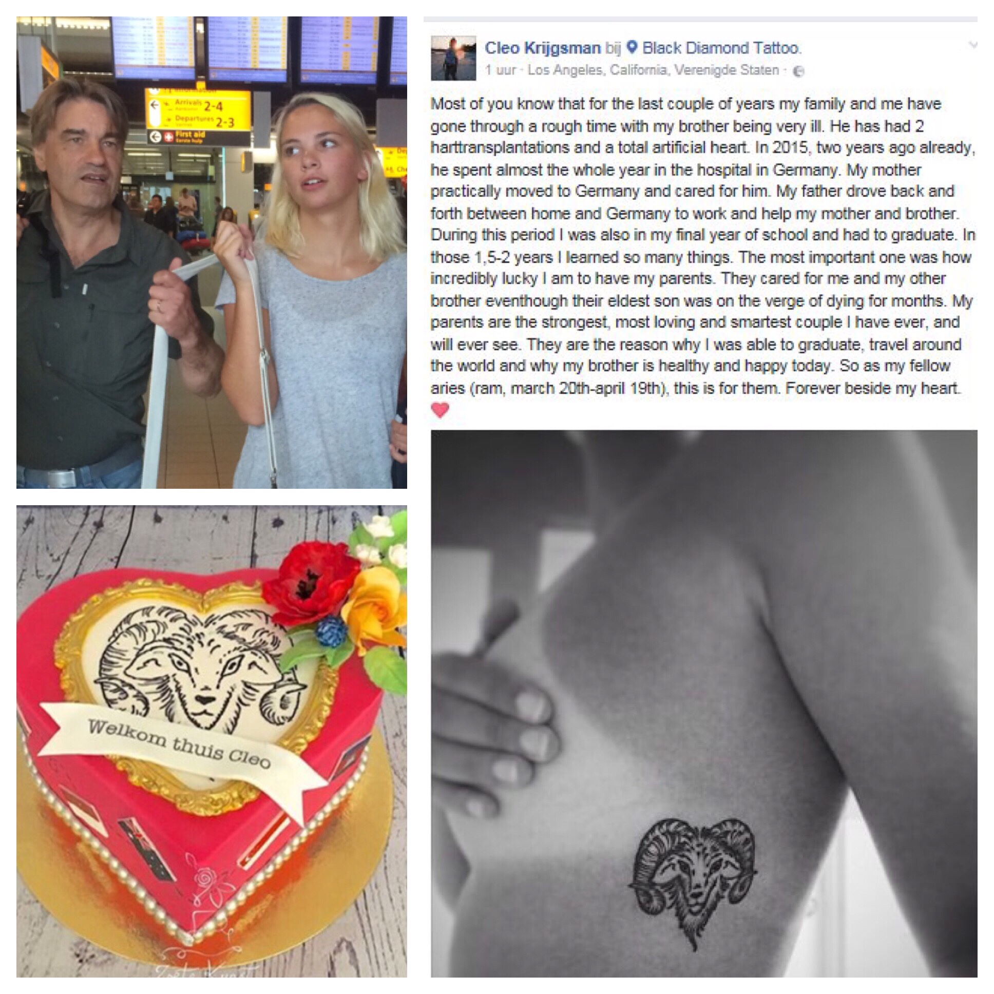 De KNO-arts was duidelijk; ‘Je bent relatief jong, hebt nooit gerookt, drinkt al jaren geen druppel alcohol en bent verder gezond. Daarom gaan we vol op genezing inzetten. Met een zware behandeling; 6 weken lang dagelijks bestralingen en wekelijks een chemokuur er bovenop. Ze versterken elkaar. Kan zijn dat je niet alle chemo’s kunt volmaken; of omdat je het zelf fysiek niet trekt, of omdat je afweer te laag wordt en het onverantwoord is. We moeten voordat de behandeling kan beginnen van alles invoeren en plannen, nog even geduld dus.’ Hij sloot af met een dringend advies: ‘meld je ziek als de behandeling start. Je zult je de eerste weken nog goed voelen, maar na de laatste chemo en bestraling werkt alles nog door. Ga uit van zeker een half jaar uit de running.’ Daarmee stapten we in de auto naar huis. De familie wist nog van niks en dat wilden we even zo houden. Eerst naar Schiphol: Cleo vloog ergens boven de Atlantische Oceaan – onderweg vanuit Los Angeles – en landde om 17.00 uur na haar wereldreis. Het weerzien met haar broers, vriend en ons moest een gelukkig moment zijn. Voor ons allemaal, en zeker voor haar als blij papa’s-kindje. En dat lukte. De volgende ochtend bij het gezamenlijke ontbijt vertelde Robin de kinderen welke zware behandeling hij zou moeten ondergaan. Het welkomthuisfeestje (zie taart, tattoo + uitleg) op zondag met de familie had een totaal andere lading.